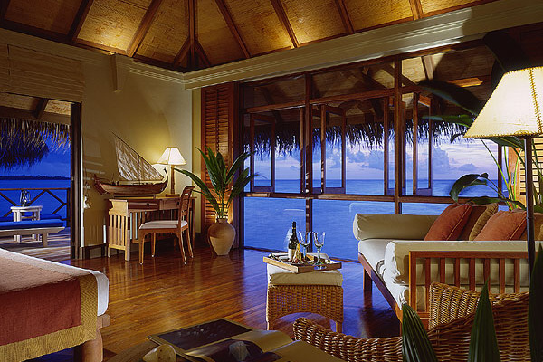 - 2 Two-Bedroom Water Bungalow - 173 кв.м, виллы над водой, состоят из 2-х просторных спален. В каждой спальне: небольшая зона гостиной с диваном и письменным столом, 2 ванные комнаты, большая терраса (99 кв.м) с шезлонгами, нижняя платформа с душем. Рассчитаны на 6 взрослых или 4 взрослых и 2 ребенка.
