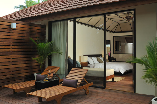 - Beach villa (68 кв. м): терраса, спальня с кроватью queen-size, ванная комната на открытом воздухе с джакузи и душем. Расположены на пляже.
